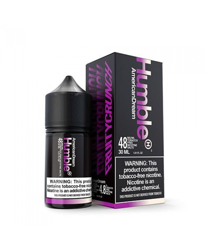 What is American Dream vape juice? American Dream by Humble Salt is a perfectly balanced vape juice blend that is extremely delicious. You wouldn't believe how remarkably tasty this flavor profile is, as it offers a trio of flavors, including fruit, breakfast bar, and creamy milk. It is a set of unique, complex tastes that come together to make for the most perfect vape. From a smooth and flavorsome inhale that balances itself out to an awesome balance of the three flavors on the exhale. And the taste only lingers making it a favorite. Humble Salt American Dream comes in a 30mL size bottle and uses 48mg salt nicotine.