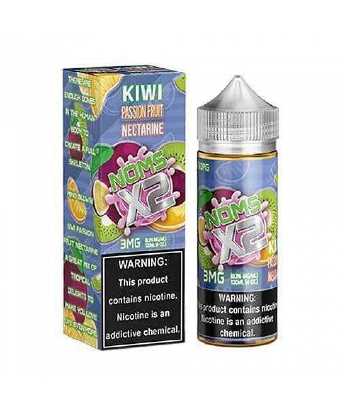 What does Kiwi Passion Fruit Nectarine taste like? Kiwi Passion Fruit Nectarine by Noms X2 tastes like a symphony of fruit flavors, all mashed together to create the most satisfying taste. It is a flavor experience that utilizes vapor to fill your airways, leaving your mouth satisfied, flavor-filled, and urging your tastes to explore even more. This amazing concoction consists of kiwis and the nectar of tropical and tangy passion fruit. Kiwi Passion Fruit Nectarine vape juice is available in a 120mL bottle and consists of 0mg, 3mg, and 6mg nicotine strengths.