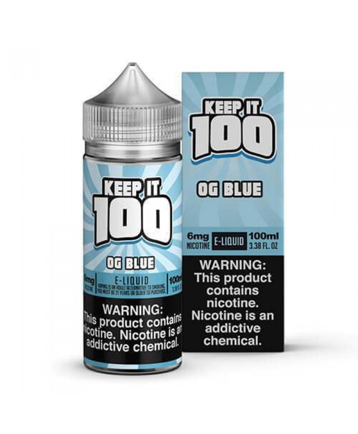 What does Keep It 100 OG Blue taste like? OG Blue by Keep It 100 tastes like your favorite convenience store slushie, and luckily, this vape juice delivers it as an all-day treat. It has a refreshing mix of flavors that will surely make each puff more and more satisfying. It combines the mouthwatering flavors of sweet strawberries and tangy blue raspberries, leaving you with a mixture you won't get tired of. You can find these flavors packed inside of a large 100mL bottle with a satisfying dose of nicotine, with multiple strengths to choose from, which include 0mg, 3mg, and 6mg depending on your preference.